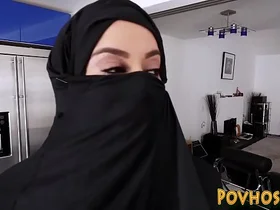 Busty Muslim office slut sucking and riding a huge black cock in a burka